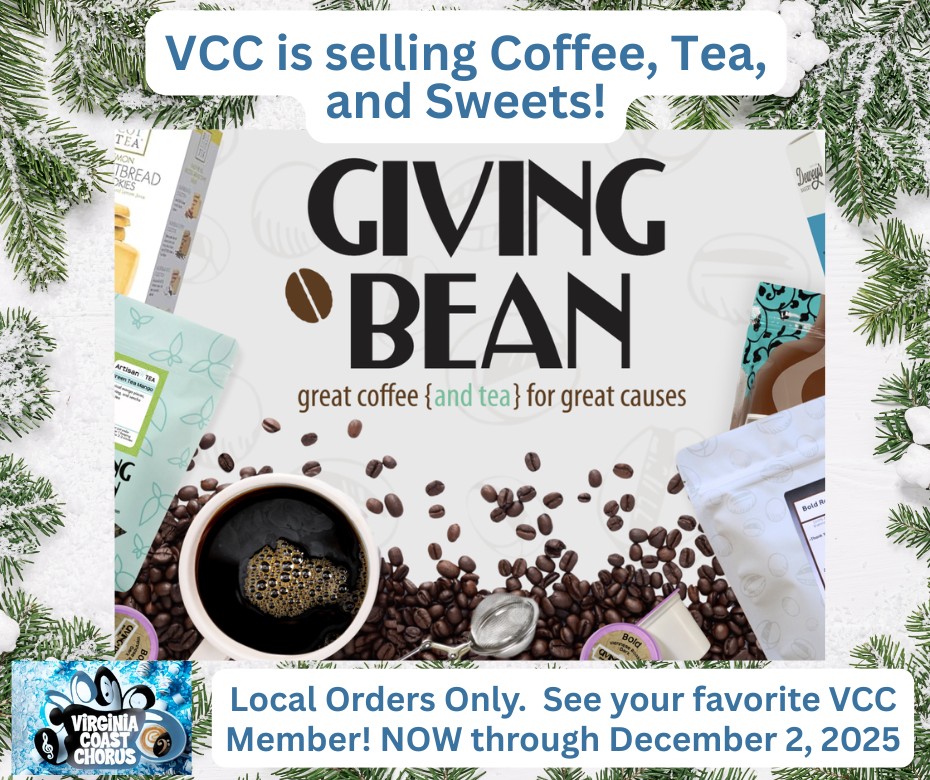 We’re brewing up something special! Virginia Coast Chorus is partnering with Giving Bean to raise funds for our musical mission — and you can help by stocking up on delicious coffee, artisan teas, and gourmet treats. These make a perfect Holiday gift too!
